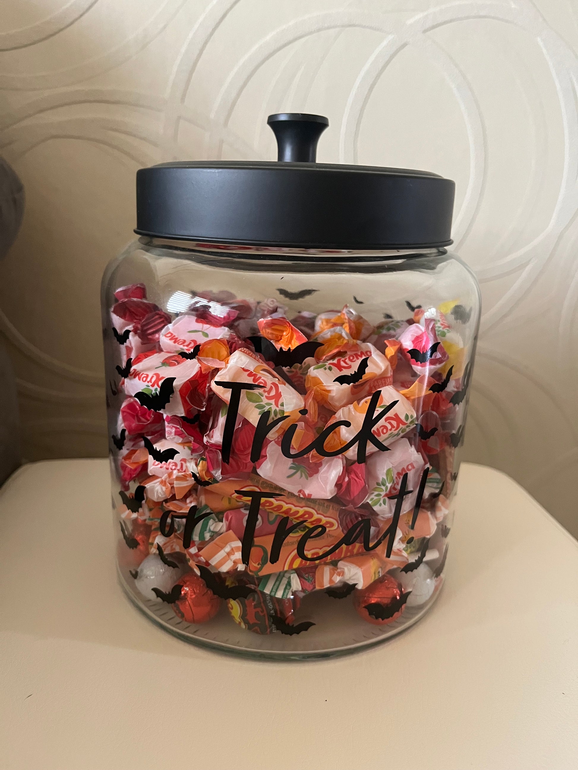 Apportez une touche d’Halloween à votre intérieur avec cette jolie bonbonnière en verre décorée de petites chauves-souris noires et de l’inscription “Trick or Treat”.